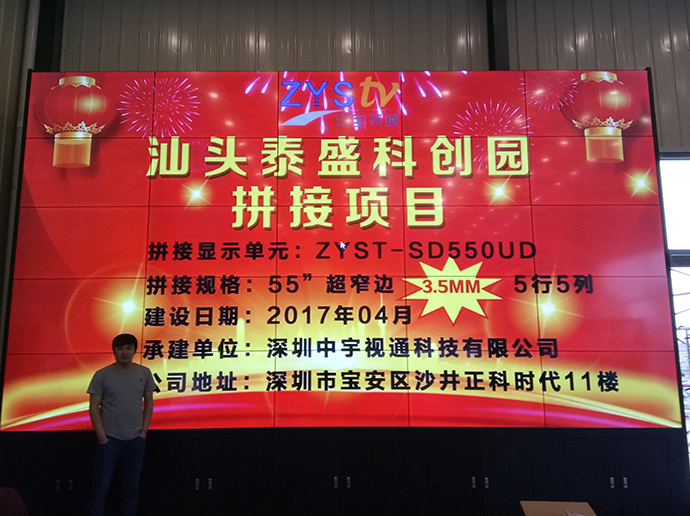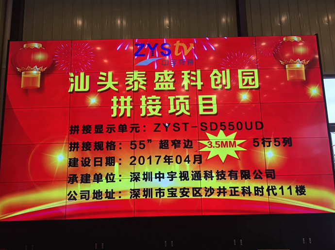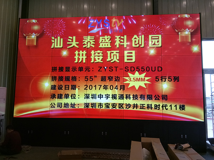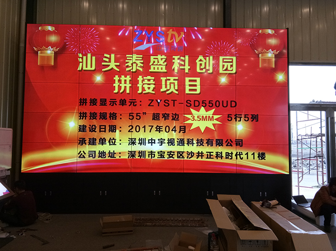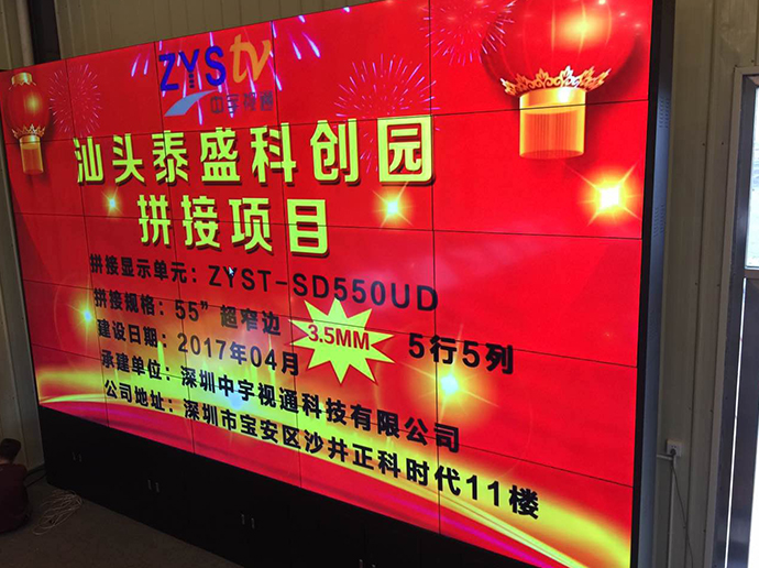此次泰盛科技為了更好的展示公司以及園區(qū)信息,進過考察與深圳中宇視通科技有限公司攜手合作成功打造了一個5行5列55寸3.5mm拼縫拼接大屏。