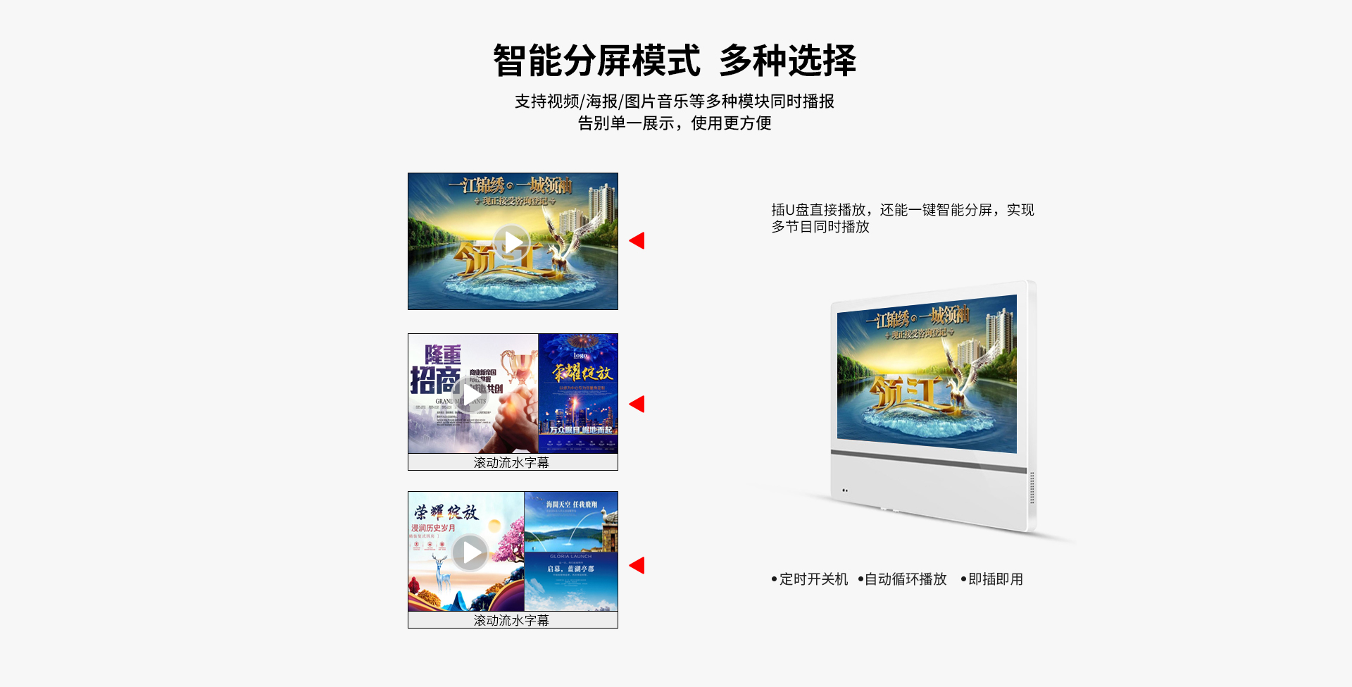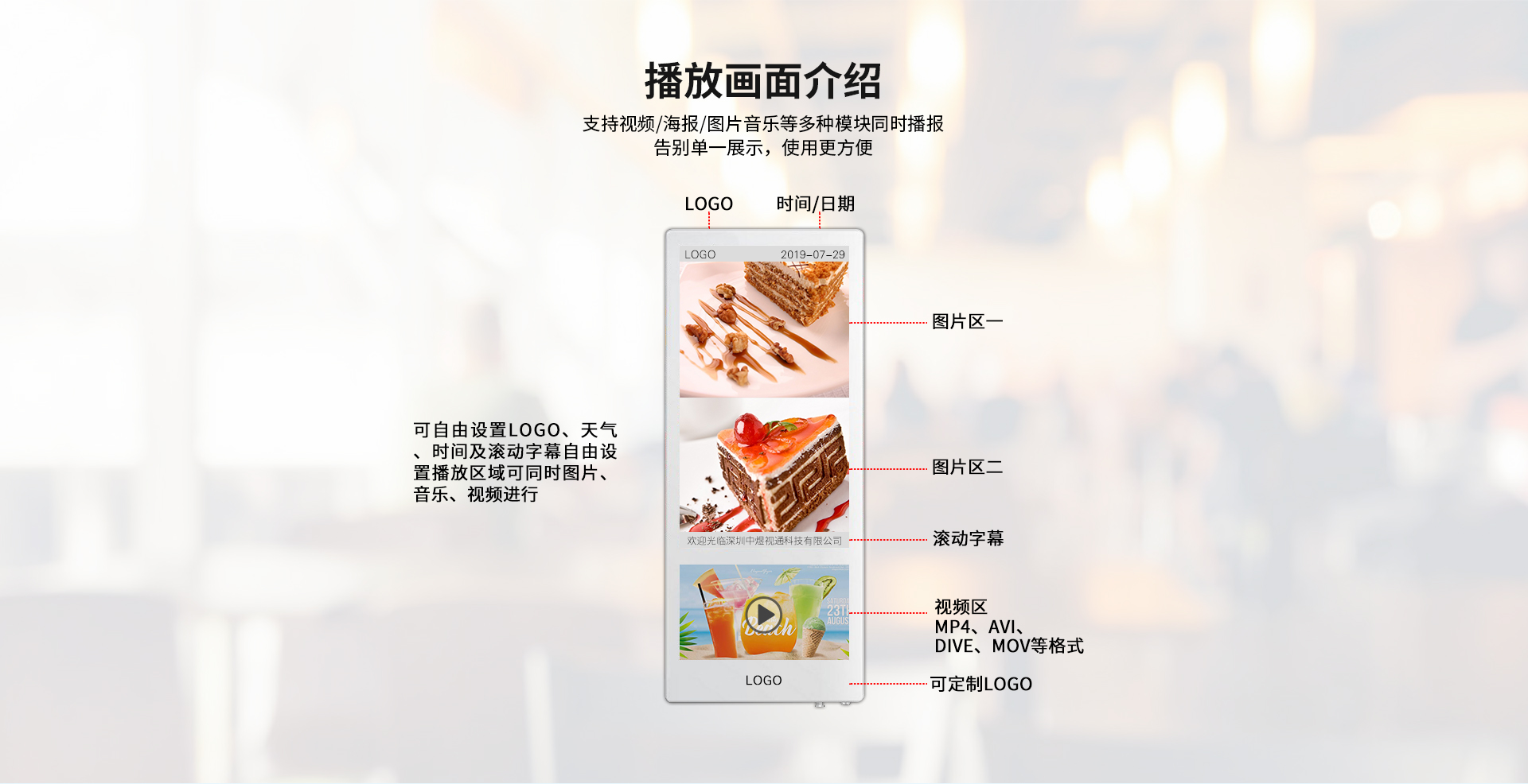多媒體播放功能:18.5寸電梯廣告機可以實現數字化多媒體播放,可以播放音頻、視頻、圖片、文檔等一系列媒體文件。支持主流的(MP3,APE,FLAC,AAC,OGG)等音頻格式。同時支持多種格式(MKV,MPEG4,AVI,FLV,MOV,RMVB,WMA)視頻播放,還支持各種圖片文檔類(JPEG, BMP, PNG,GIF )的廣告播放功能。