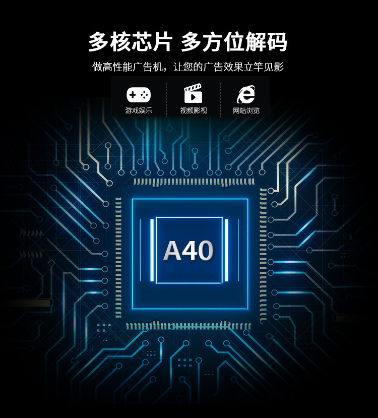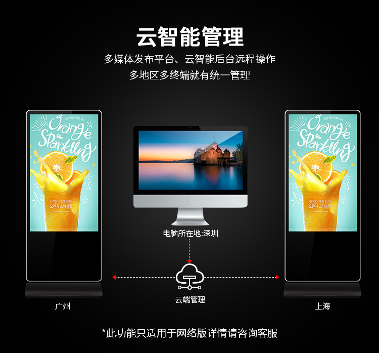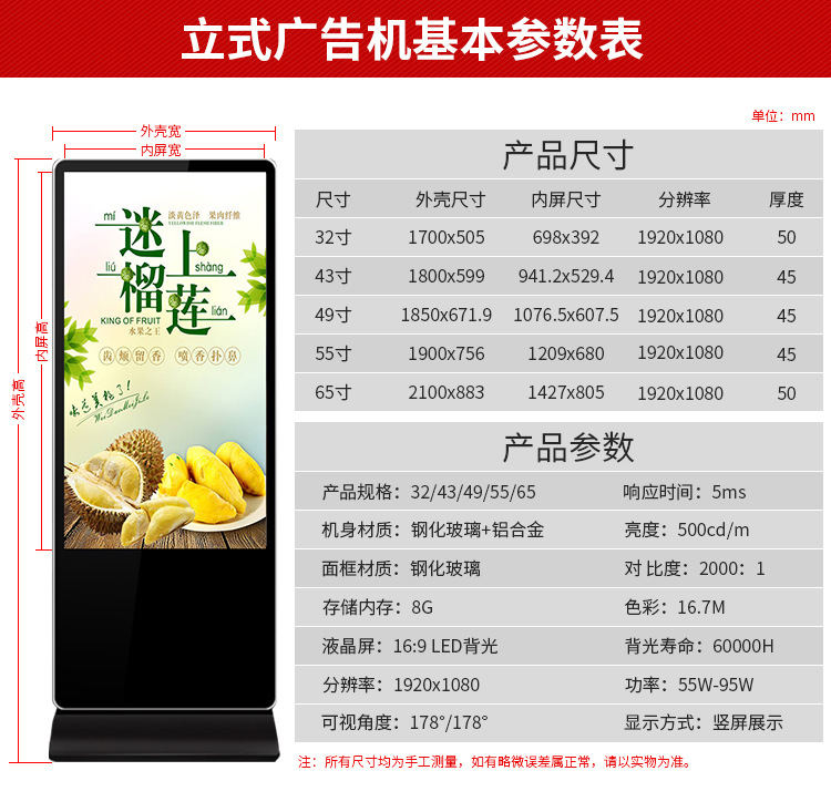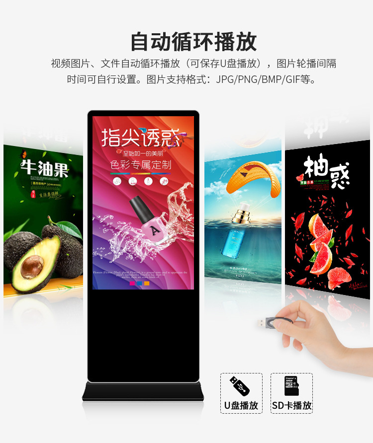 49寸立式液晶廣告機系列產品屬于壁掛、落地式數字標牌廣告機,外觀優美,全身五金冷軋鋼板噴涂,邊條鋁合金型材,面板4MM專用鋼化玻璃,橫式16:9液晶屏,高清效果。內屏采用三星、LG原裝工業級液晶屏,配以最先進的密集型LCD光源背光系統,背光色彩還原度好,超高對比度,強光下依然清晰無比。特別適合高端品牌的綜合多媒體技術,向消費者傳遞全方位的產品信息,促銷信息等。提升產品在銷售終端的顯現率和陳列效果,刺激沖動性購買。相比于其他傳統媒體和促銷方式,投入極低廉,性價比極高。