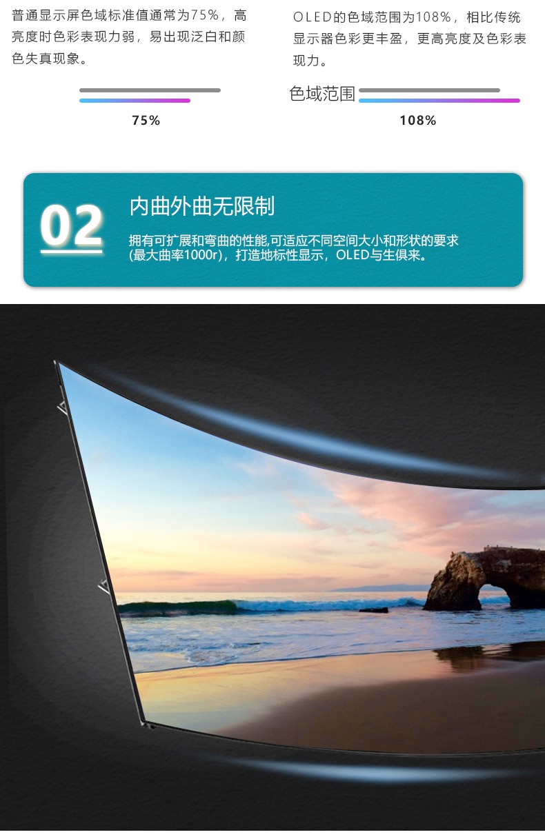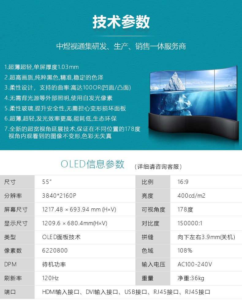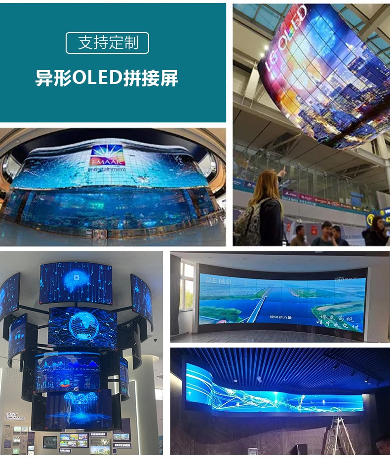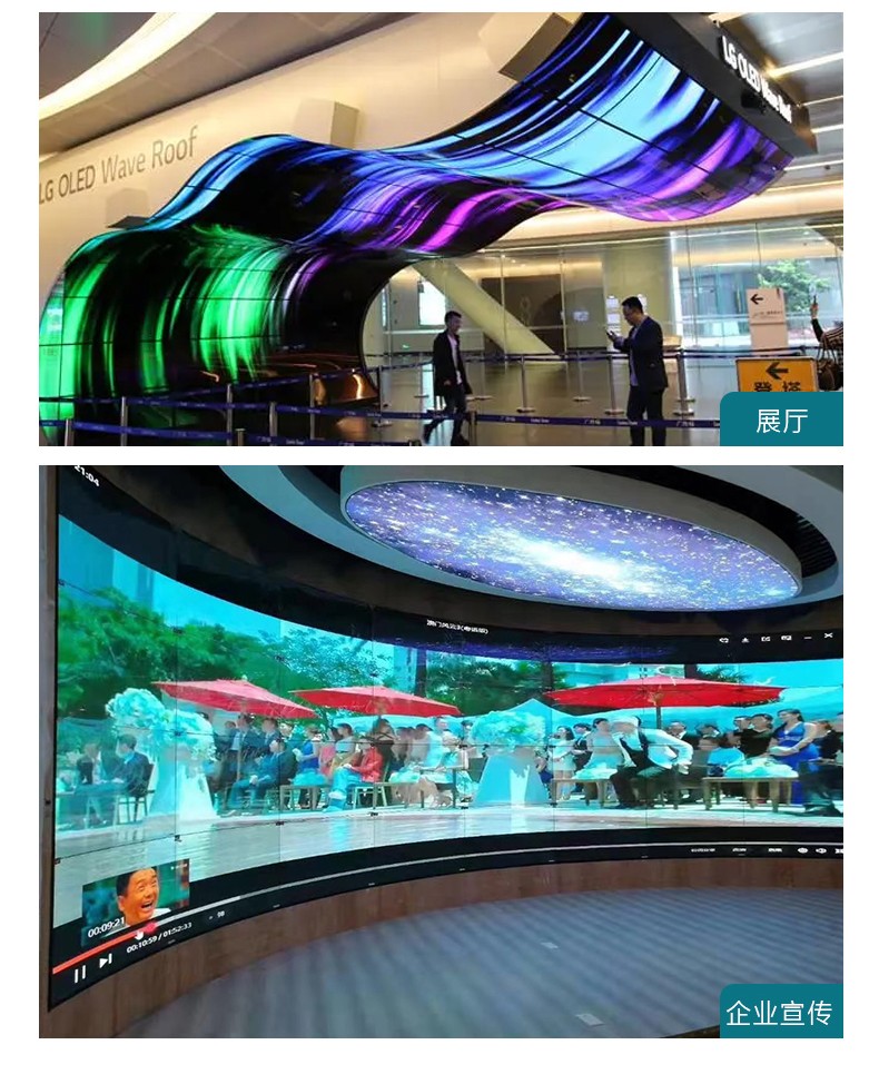 OLED柔性拼接屏是一種采用機發光半導體,通過注入載流子和復合導致發光的一種技術,是一種在電場驅動下利用多層有機薄膜結構產生電致發光的器件,并且引入了液晶拼接屏可拼接的性能,實現大屏幕顯示;OLED柔性拼接屏采用最新的OLED顯示技術,面板超輕、超薄,可彎曲,支持弧形、曲面拼接。
